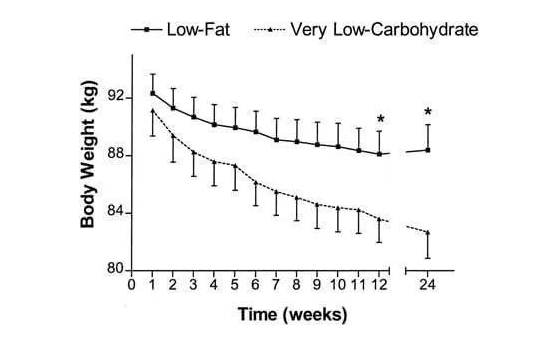 实验结果就是两组人的体重都有所减轻,但低碳水饮食那一组减重效果更为明显。