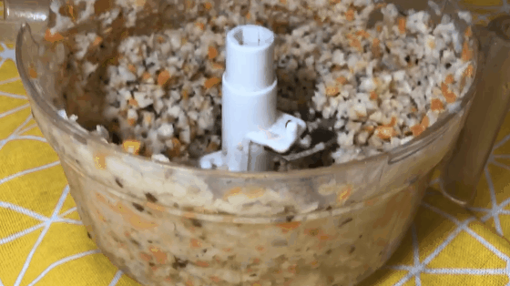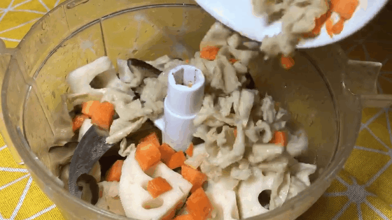 2. 红萝卜,莲藕,香菇,蛋白素肉切块,放入搅拌器中。