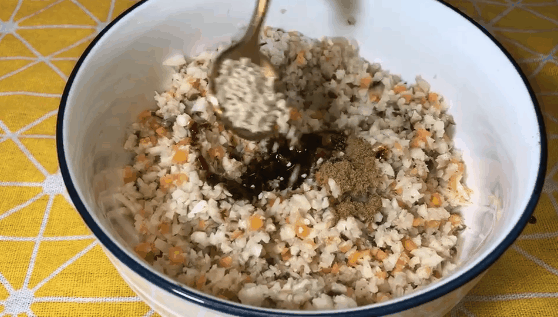 4. 搅拌好的食材放入大碗中,加入老抽、盐、蘑菇粉、素蚝油拌在一块,就可以开始包饺子啦。