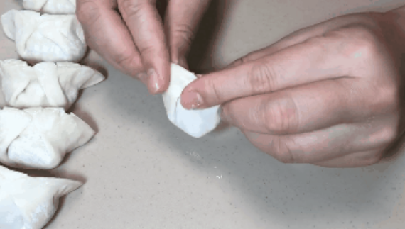 6. 将饺子皮对折,沿着边捏出折角,边边捏紧即可。